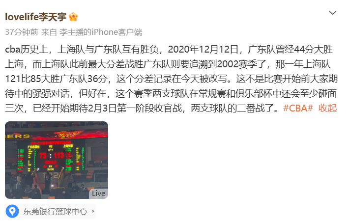 担任本场比赛的解说员媒体人李天宇表示:上海队与广东队历史上互有胜负,2020年12月12日,广东队曾经44分大胜上海,而上海队此前最大分差战胜广东队则要追溯到2002赛季了,那一年上海队121比85大胜广东队36分,这个分差记录在今天被改写。这不是比赛开始前大家期待中的强强对话,但好在,这个赛季两支球队在常规赛和俱乐部杯中还会至少碰面三次,已经开始期待2月3日第一阶段收官战,两支球队的二番战了。