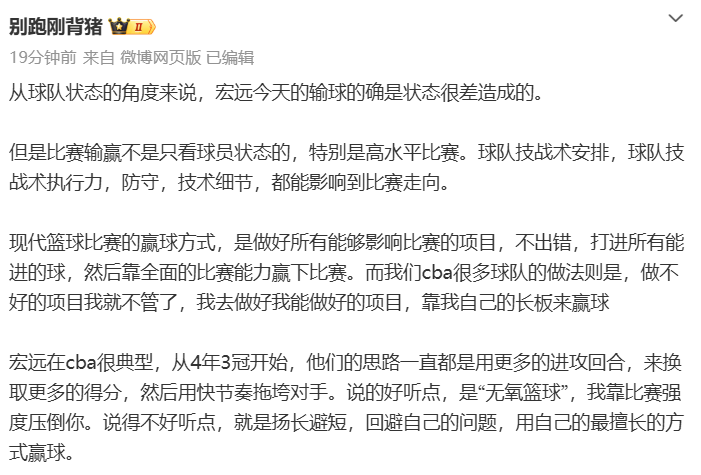 别跑刚背猪认为:从球队状态的角度来说,宏远今天的输球的确是状态很差造成的。宏远是典型的靠长板来赢球,从4年3冠开始,他们的思路一直都是用更多的进攻回合,来换取更多的得分,然后用快节奏拖垮对手。说的好听点,是“无氧篮球”,我靠比赛强度压倒你。说得不好听点,就是扬长避短,回避自己的问题,用自己的最擅长的方式赢球。